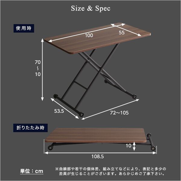 スタイルに合わせて調節可能な昇降テーブル。コンパクトに収納可能な折りたたみ式で収納場所に困りません。天板は幅100cmで広く使用可能でデスクワークにも最適!